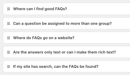 Each FAQ is assigned to one or more answer groups to make sure they appear on the right page. You can generate new answer groups as quickly as just typing the name of the new group.