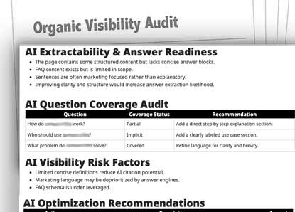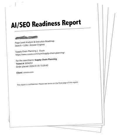 An AI/SEO Readiness Report evaluates your site’s high-value pages to identify barriers to visibility in search engines and large language models.