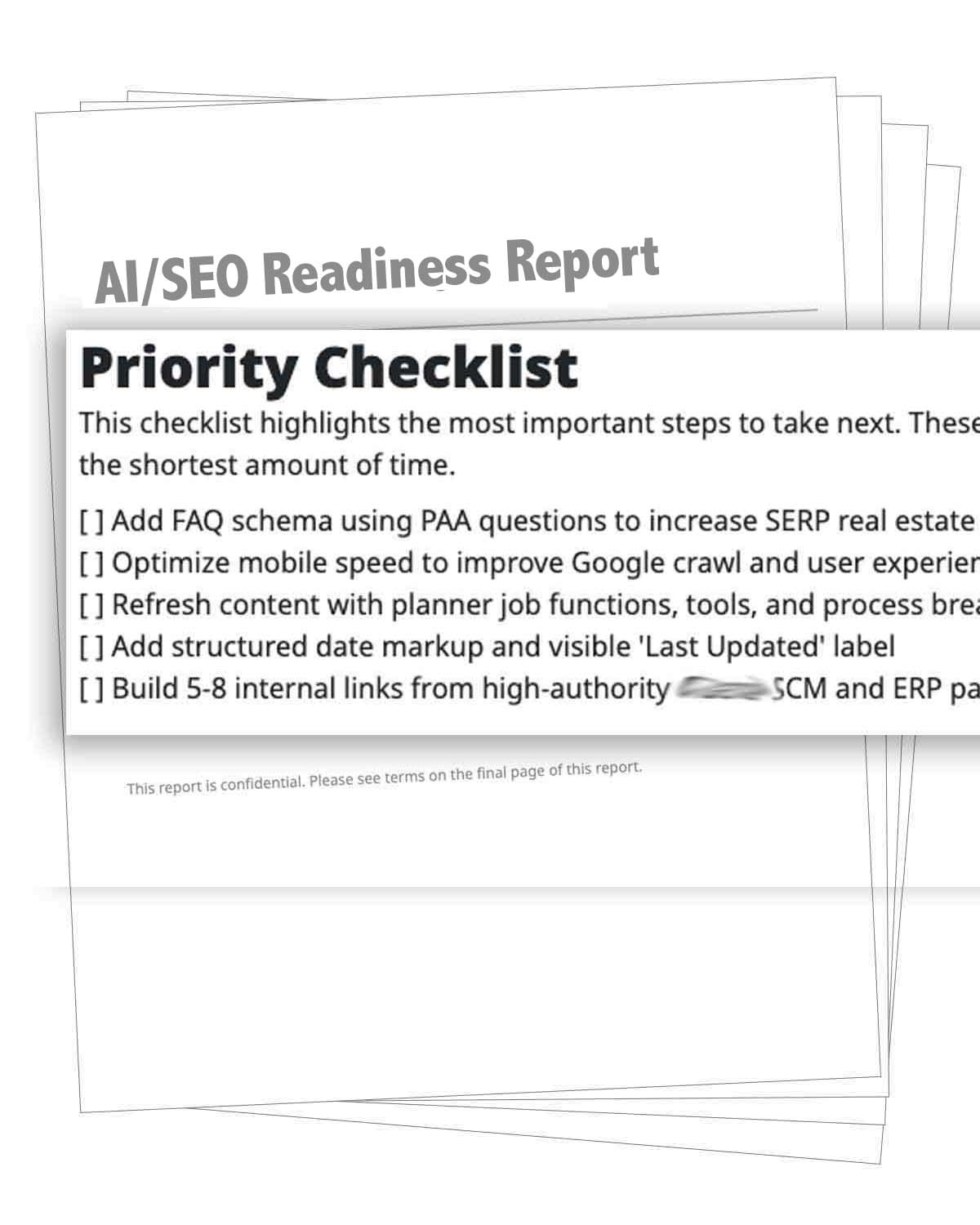 An AI/SEO Readiness Report evaluates your site’s high-value pages to identify barriers to visibility in search engines and large language models. It provides a prioritized checklist and a clear roadmap to improve discoverability, relevance, and rankings.