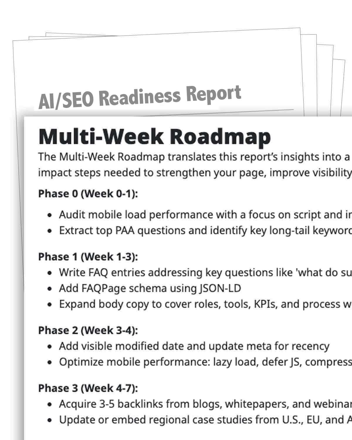 Each report covers an individual high-value page. You receive a written report that starts with action: a prioritized checklist and a multi-week roadmap.