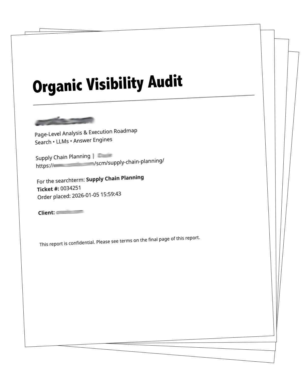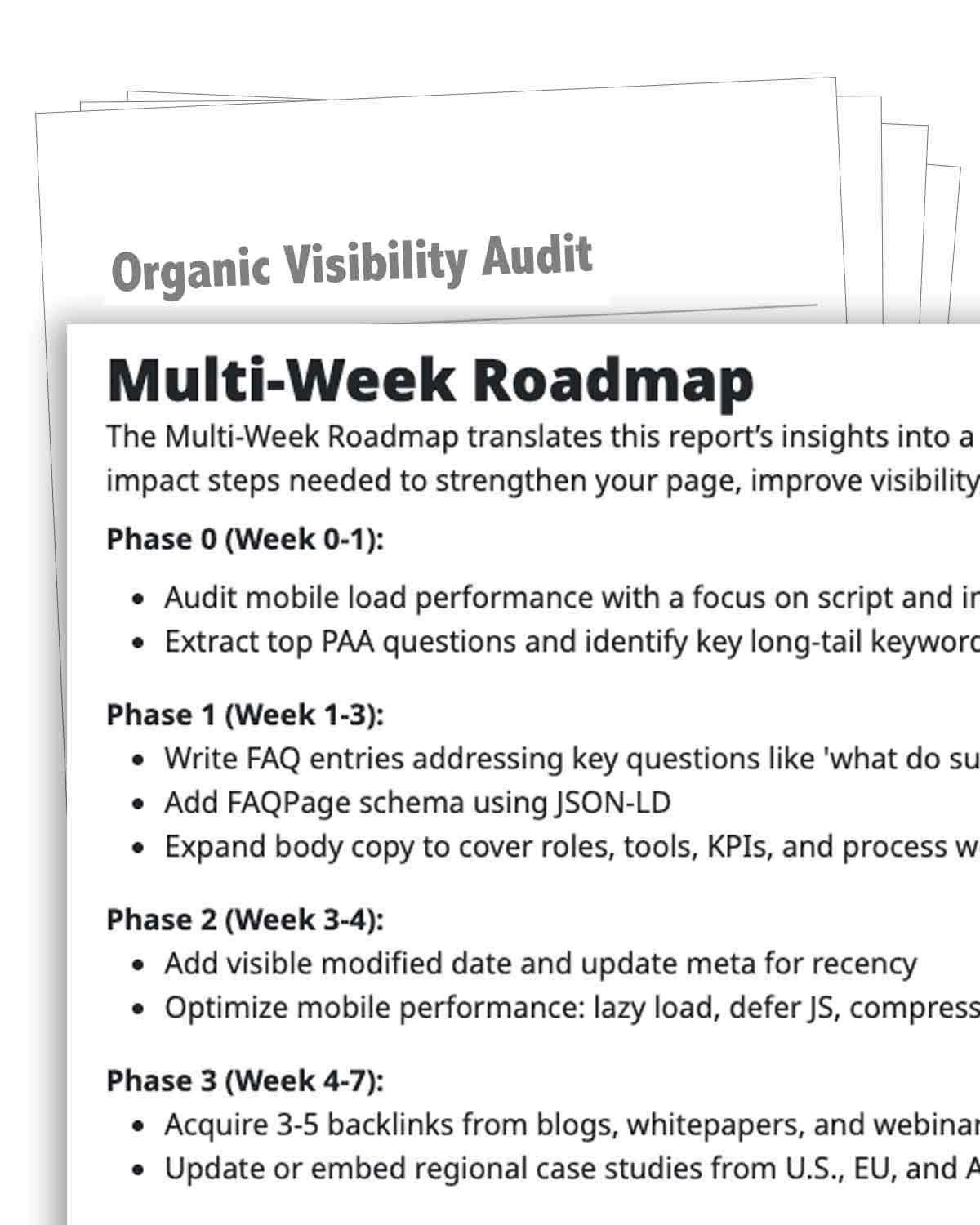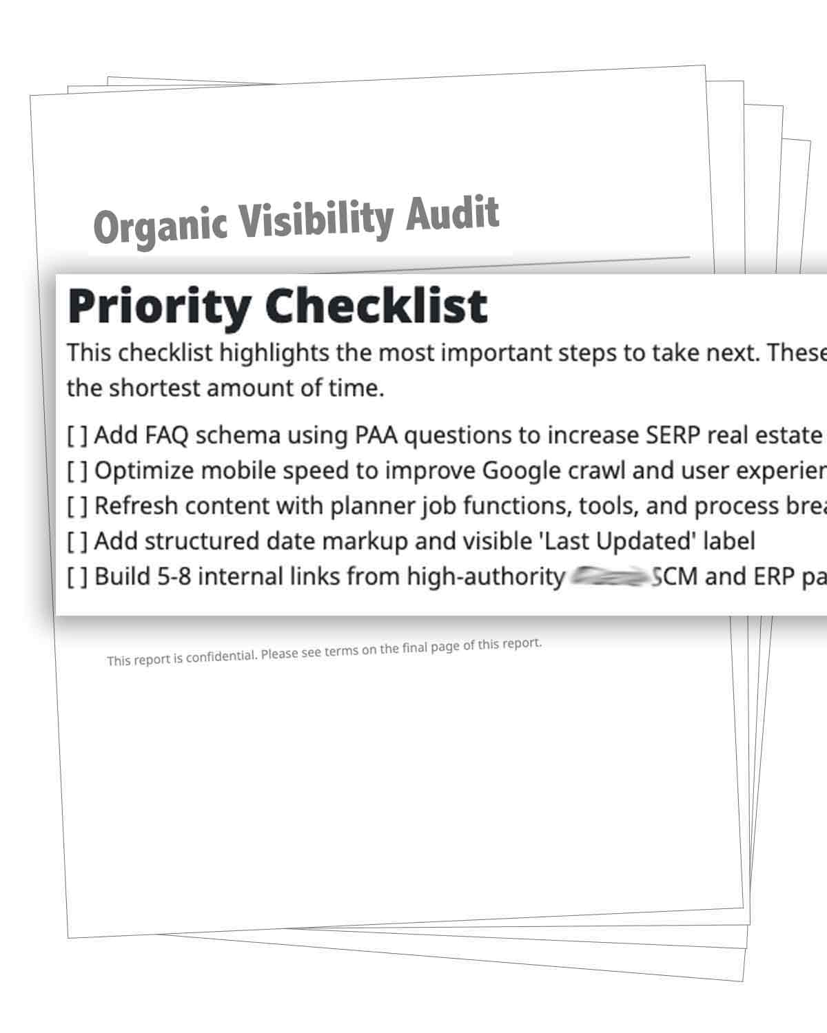 Organic Visibility Audits are reports that look at your high-value pages and figure out what can be done to make them earns more visibility in search engines, LLMs, and answer engines. A Priority Checklist and a Roadmap provide your team the tools to help make the pages rank better.